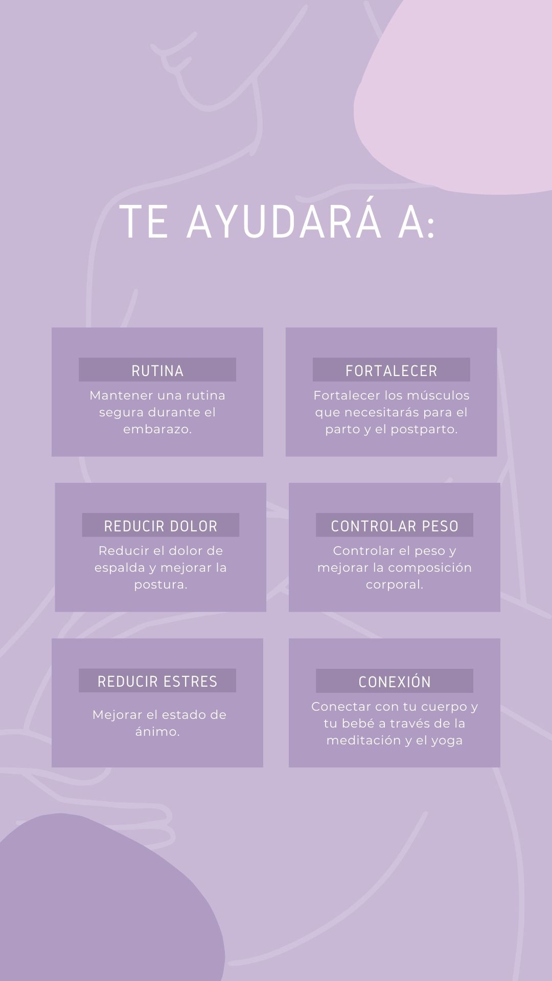 Se basa en una combinación de ejercicios de fuerza, cardio, yoga y meditación, adaptados a las necesidades y objetivos de cada mujer en cada etapa del embarazo.
