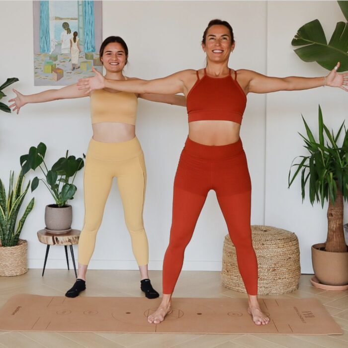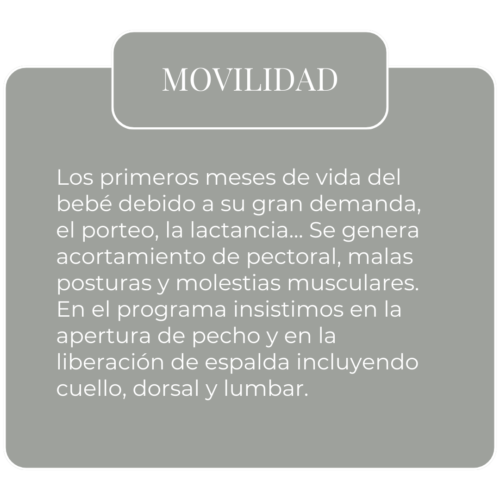 Sesión de estiramientos y respiración centrada en el tren superior para liberar la zona pectoral y restablecer la postura tras las largas horas con el bebé.